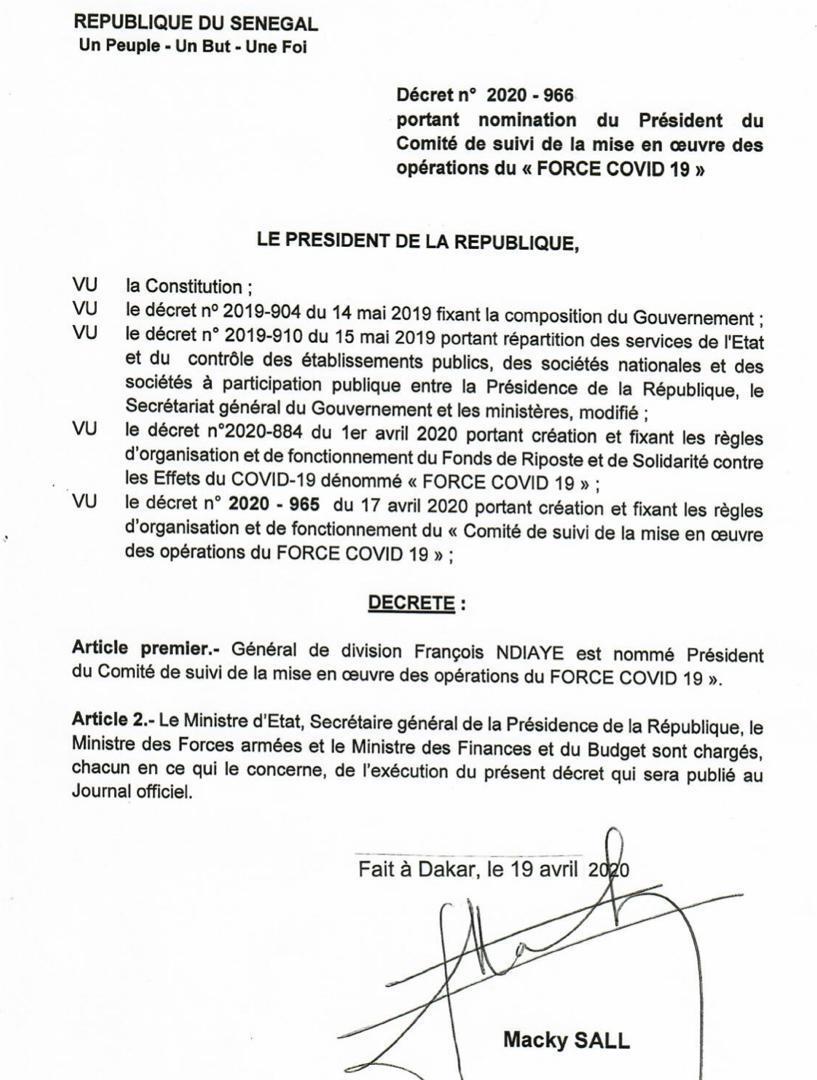 (Equonet-Dakar) - Le président Macky Sall a nommé aujourd'hui le général de division François Ndiaye à la tête du comité de suivi de la mise en oeuvre des opérations de la force covid19.